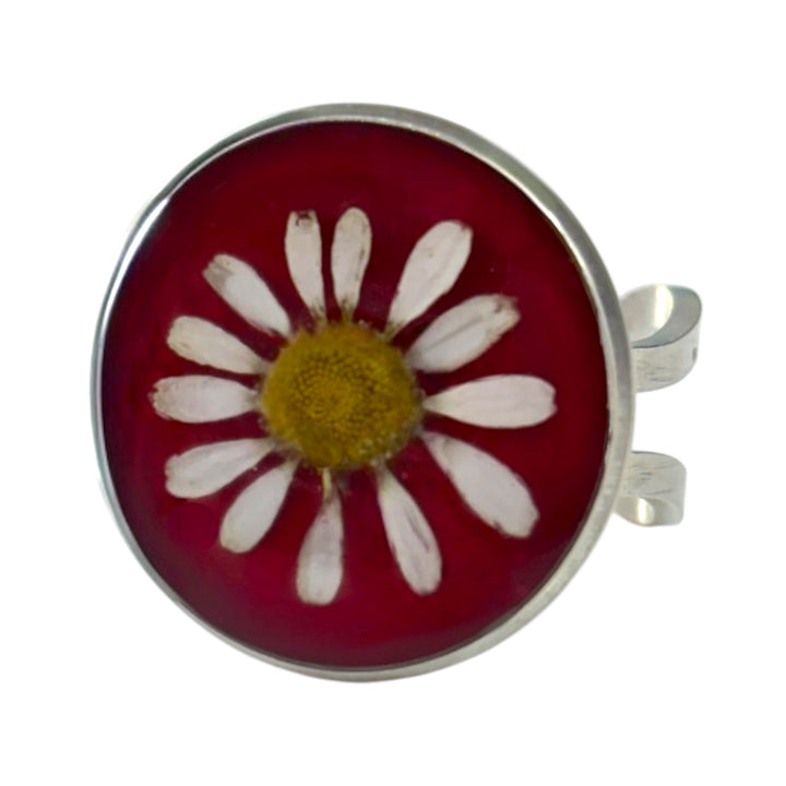 Una margarita blanca, símbolo de pureza y frescura, sobre un fondo granate profundo que transmite elegancia, fuerza y sofisticación. Este anillo une delicadeza natural con la intensidad del color, creando una joya única hecha a mano con flores reales preservadas.