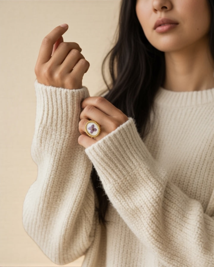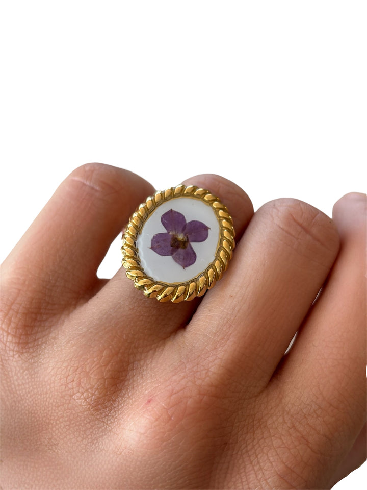 Una flor violeta sobre fondo blanco y marco dorado trenzado. Este anillo refleja equilibrio y sensibilidad, una fusión de delicadeza y carácter en una joya atemporal.