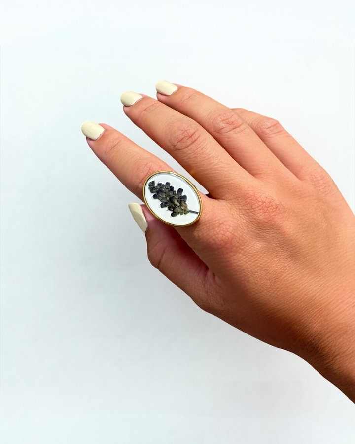 💜 Una ramita de lavanda sobre fondo blanco translúcido. Este anillo transmite calma y nostalgia, guardando en sus pétalos la serenidad de un recuerdo eterno.