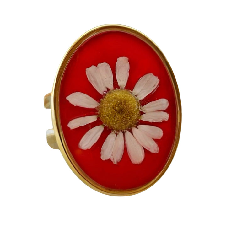 Una margarita blanca sobre fondo rojo. Este anillo, lleno de intensidad y dulzura, transmite la fuerza vital del corazón apasionado y la pureza de la naturaleza.