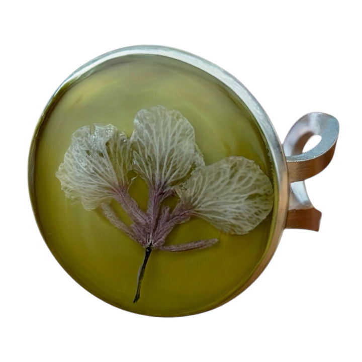 Tres pétalos blancos con nervaduras púrpura descansan sobre un fondo verde oliva. Un anillo de plata con alma botánica.