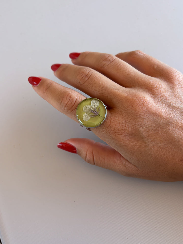 Nuestros anillos están hechos a mano con flores naturales preservadas, por eso pueden variar ligeramente del que ves en la foto. La esencia y el estilo se mantienen, pero ningún anillo será exactamente igual a otro.